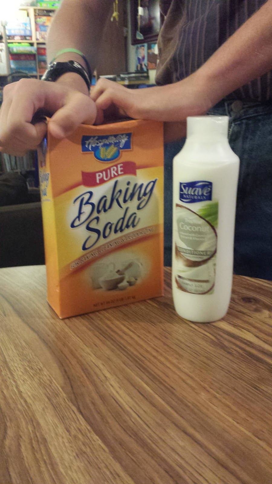 All you need is two ingredients, Baking soda and conditioner. You need 3 cups of baking soda to 1/2 cup of the conditioner. So I got the nice big box for $2 at wal-mart. Even though all the other pictures have Gabe in it, Sam did play with it too. Those are his hands, he is a teenage boy that hates having his picture taken. He however did not have as much fun as Gabe did.
