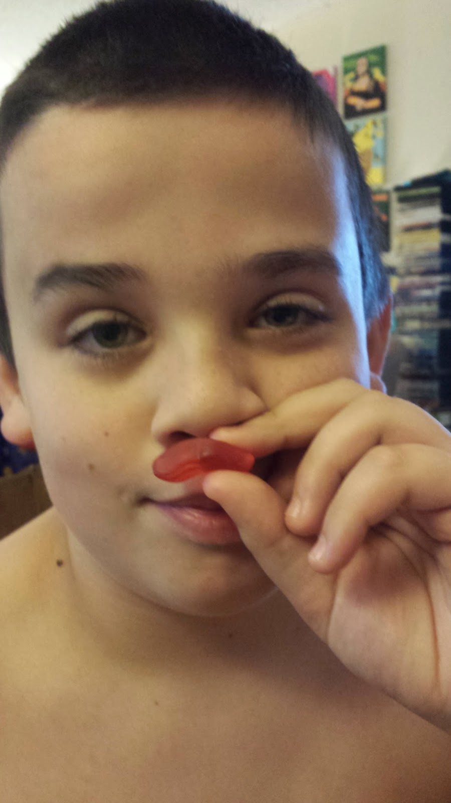 Well then the fun really happened. He got to have a snack and be silly of course. The top one incase you can not tell is a monkey head. Then he tried to be so sophisticated with a mustache. Yup we do laugh a lot with this little guy around here.