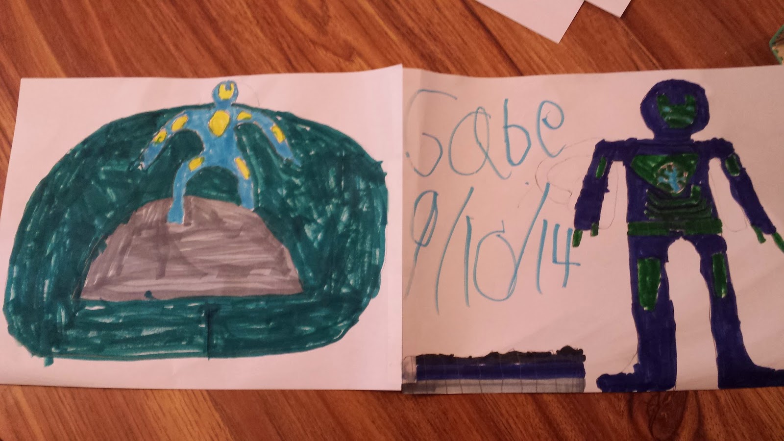 This was the lesson that they did that was for tomorrow. We got the book 52 art lab for kids from the library. The first lab was about conture drawing. They did not really follow the lesson to well but I love the end results. Sam is on the top and Gabe is on the bottom.
